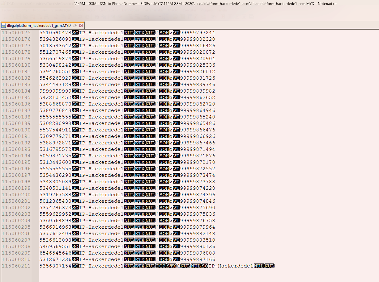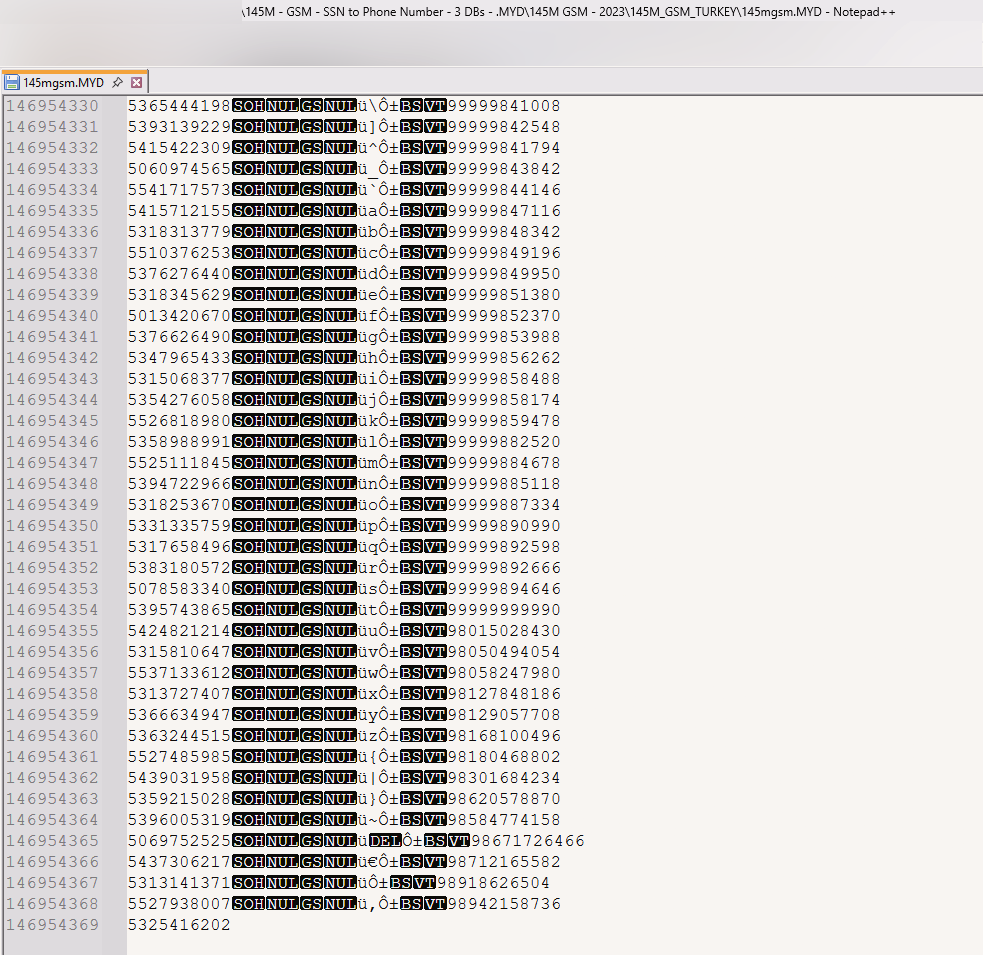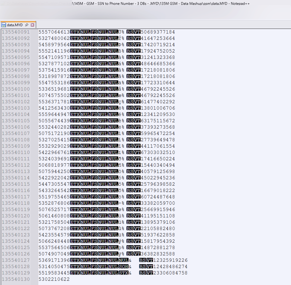 8GB+, You use these databases to convert a Turkish phone number to an SSN or an SSN to a phone number. If you want to access the data, but you don't know what you are doing, find the *.MYD file and open it with notepad++, wait until your PC loads it up, then use the search function.