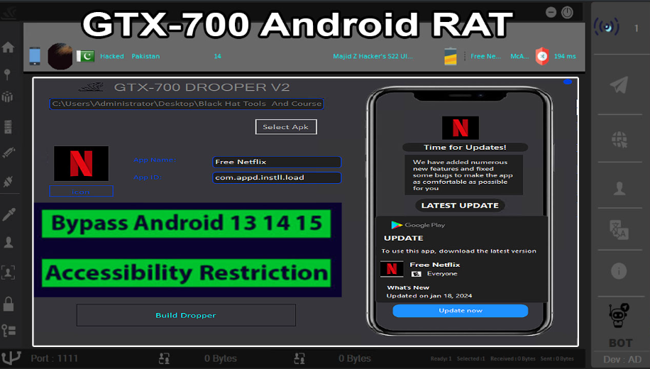 GTX-700 RAT is the best and most powerful Android device hacking software remotely worldwide. You can bypass banking apps + black screen + unlock screen + steal websites login + bypass play protect and other antiviruses and control victim’s mobile silently.